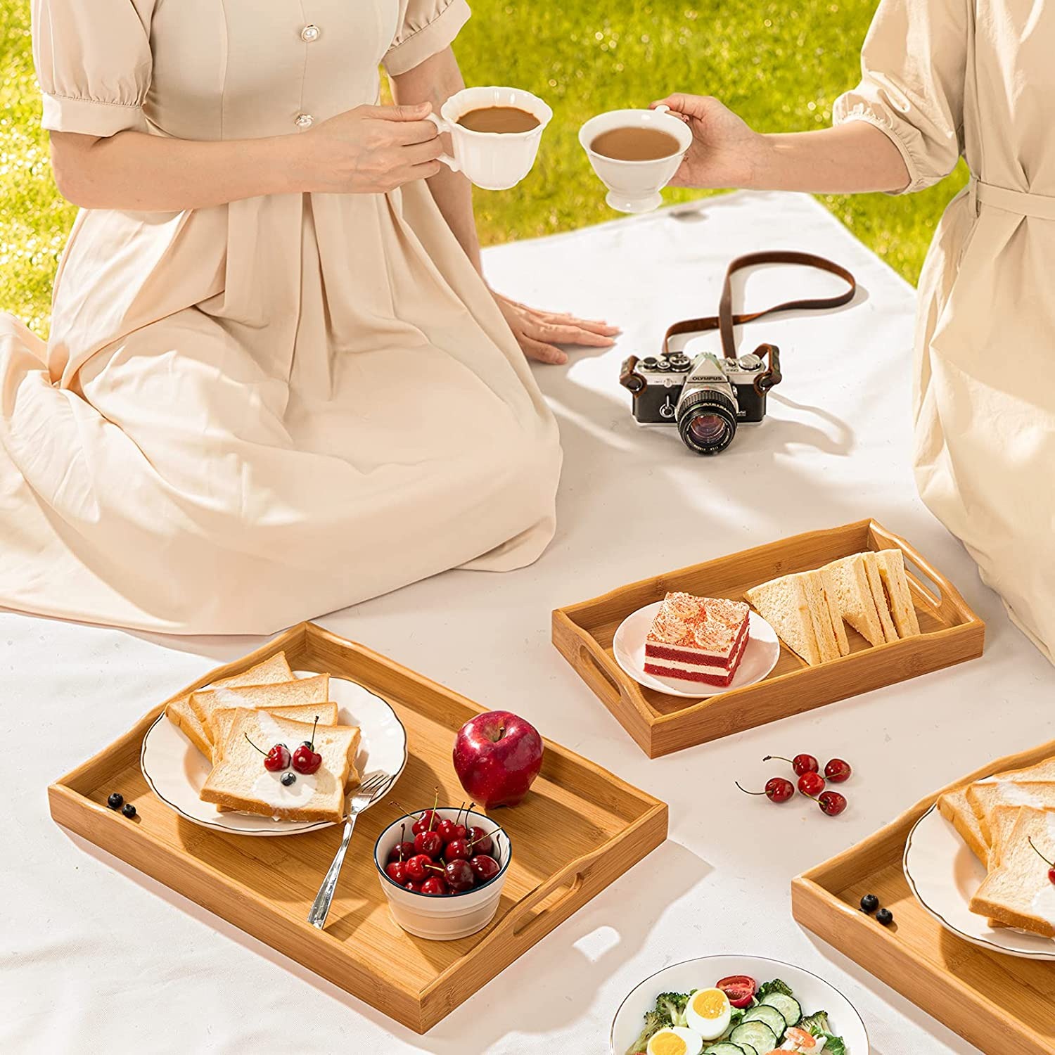 This set of 3 bamboo food trays is easy to use in any occasion, such as kitchen, dining room, party, restaurant, bathroom, hotel and outdoor. This versatile tray set can also be used as a home decor tray to organize your favorite household items such as display candles, jewelry, makeup, perfumes, and more.
