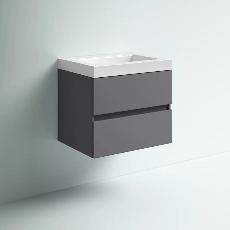Modest in size with a minimal look, this understated single-bathroom vanity is fitting for a home with and without space restrictions. Crafted from engineered wood, the frame features a hardware-free contemporary design with a fresh finish for a modern feel. A vanity top with a white finish is easy-to-clean, nonporous, and bacteria-, mold-, and mildew-resistant. A single-hole faucet mount option makes for easy installation, while its wall mounting design gives it a modern feel. Plus, two full-extension drawers are included for full access to makeup and other toiletries.