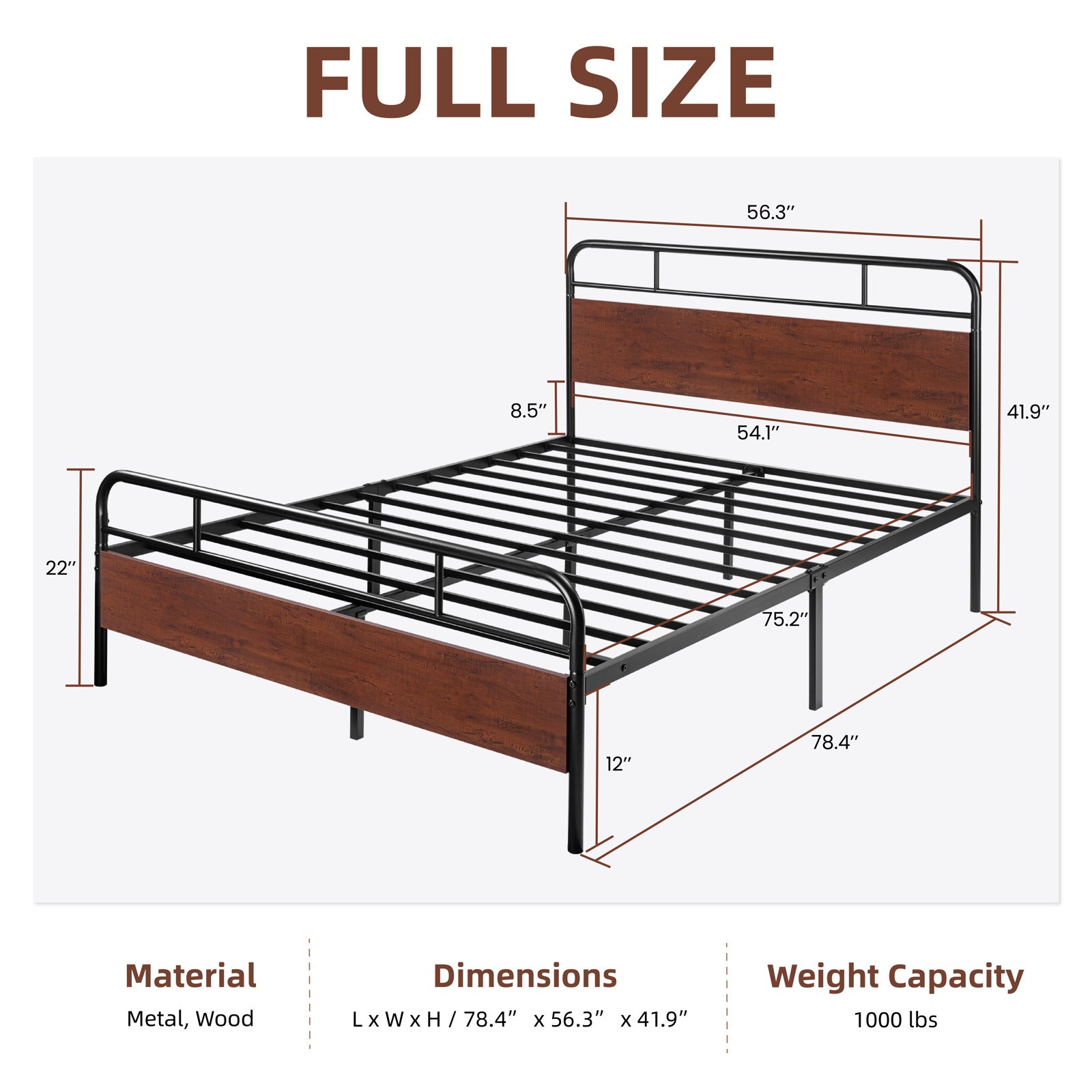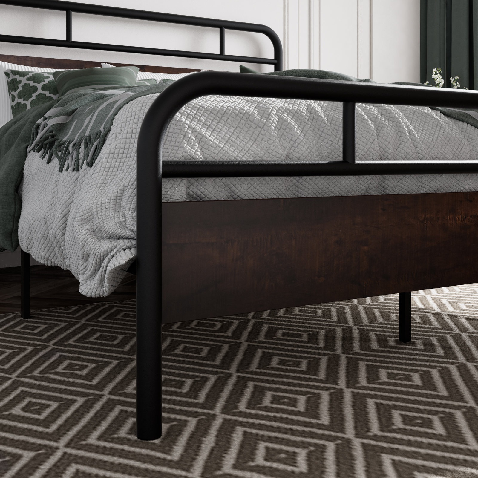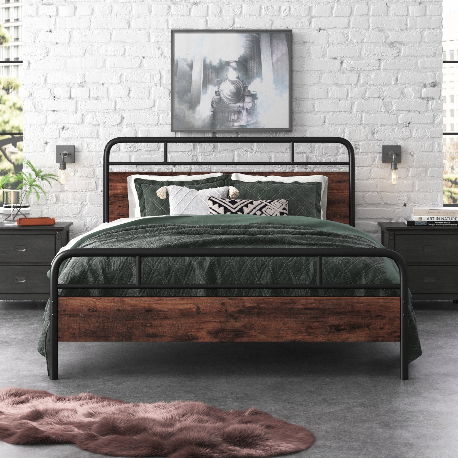 This platform bed features a sleek, modern silhouette with mixed materials to give your bedroom a blend of rustic and industrial styles. It has an iron frame that’s finished in a black hue. The open slat headboard showcases a singular engineered wood panel in a rich brown tone. With 12″ of clearance beneath the bed, there’s plenty of room to tuck away bins and storage containers. Centre legs and slats provide enough support for your mattress (mattress sold separately) without the need for a box spring.